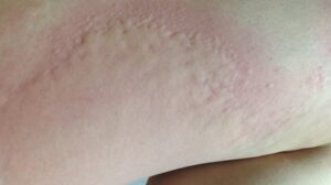 A urticária é nada mais nada menos do que uma reação alérgica causada por algum tipo de alimento ou por uso de medicamentos, dentre outras coisas. A urticária pode surgir como manchas avermelhadas e elas podem aparecer em qualquer parte do corpo causando incômodo e coceiras. A urticária desaparece sozinha após algum período.